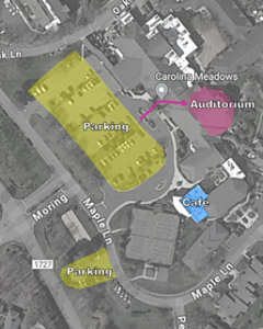 - Parking/Carpooling for Run Out Concert at Carolina Meadows (Monday, January 12): Carolina Meadows is located at 100 Whippoorwill Ln, Chapel Hill, NC 27517. This is about 15 minutes south of our regular rehearsal space at HTLC, so please budget extra time to get there if you are coming from the north. Please park in one of the areas designated in yellow on the following map. We will perform in the auditorium. The auditorium entrance is indicated in pink; just ask at the front desk if you are not sure where to go. Parking is somewhat limited; if you are worried about finding a spot, carpooling is an option: WVC Carpooling Map 2025-2026
