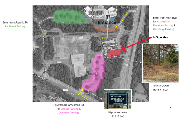 - Additional parking is available in the UNC parking lot on Homestead Road, before Aquatic Dr. (We are grateful to UNC for the use of their lot.) Note that there is a gravel path from the UNC parking lot to the church. Please reserve space in the UCCH lot for patrons who need smoother access to the venue.