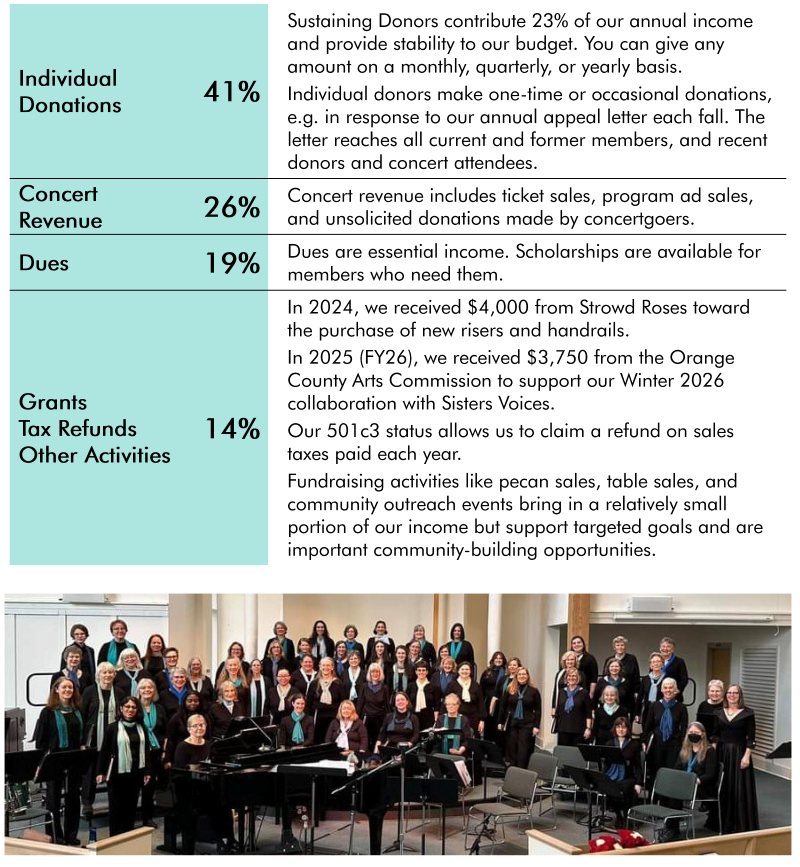 Women’s Voices Chorus relies on multiple sources of income and countless hours of volunteer labor to keep its high-quality program running.
